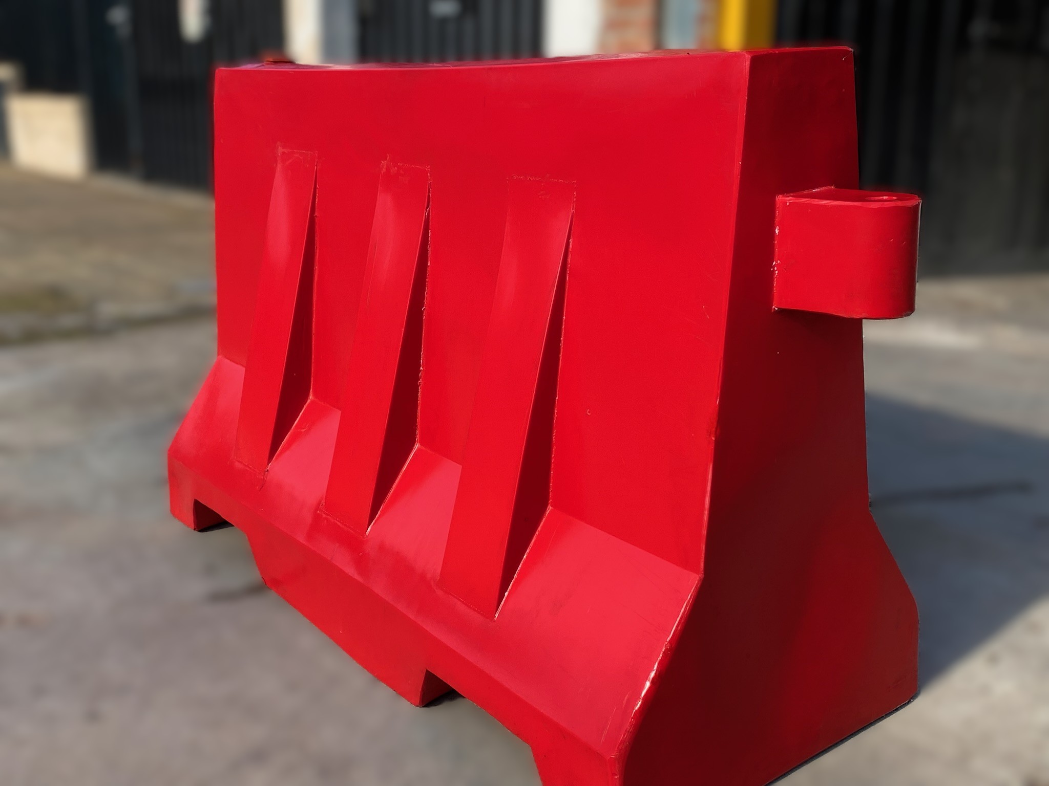La barrera vial posee una boca de carga superior y una de descarga inferior para rellenar ya sea con agua o arena.
