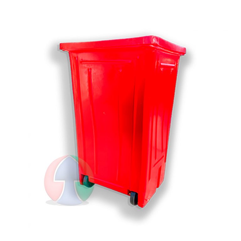 Contenedor de 130 litros, con tapa y dos ruedas plásticas de aproximadamente 95 mm de diámetro.